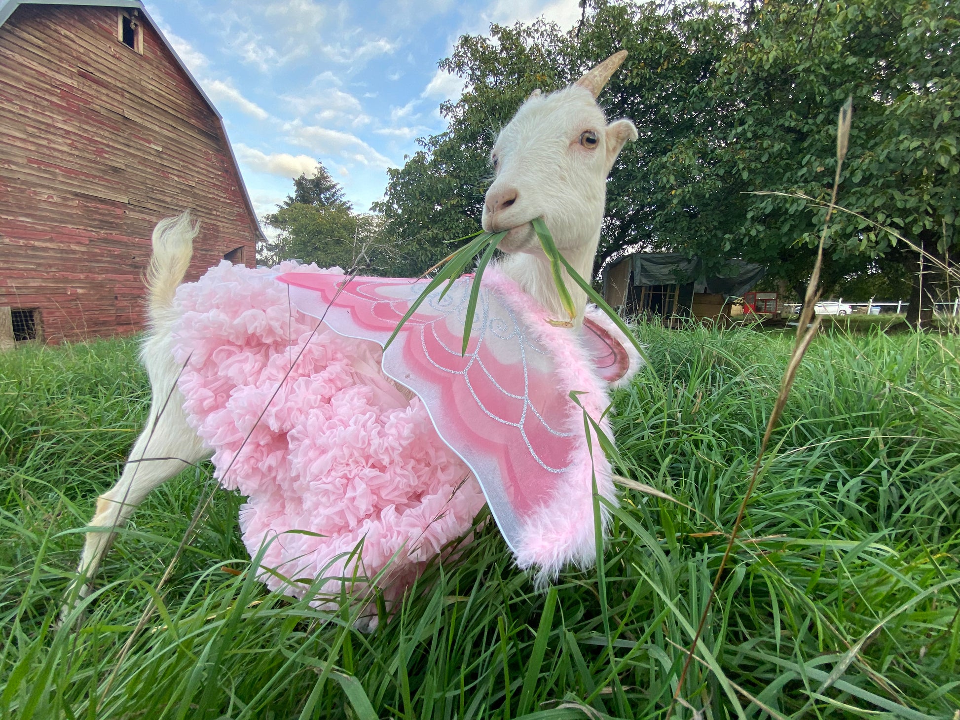 After roasting our apples and enjoying some Aebleskeevers and Chèvre (Festive Danish pancake balls), we will head into the barn and dress up the goats in costumes and hand out treats!