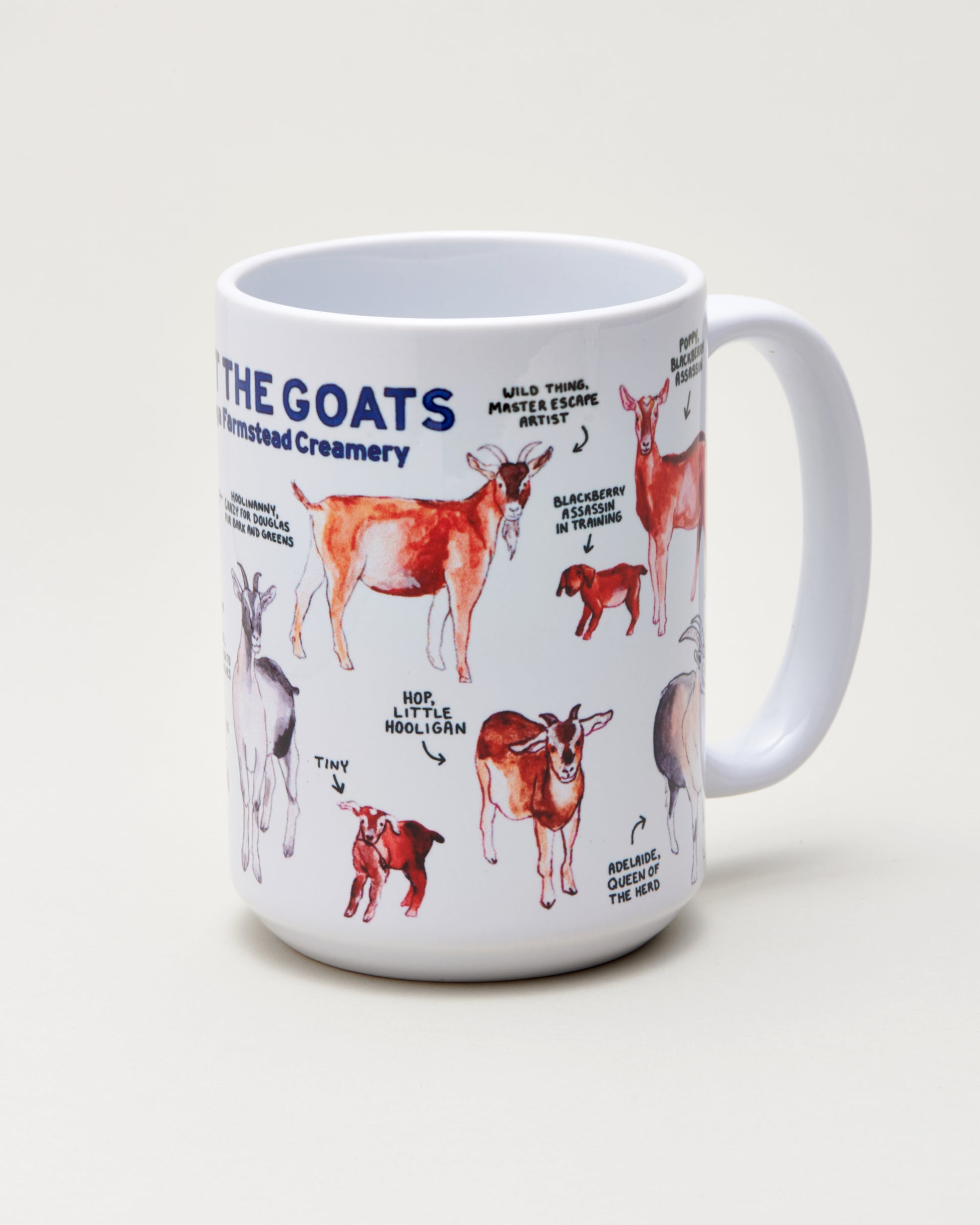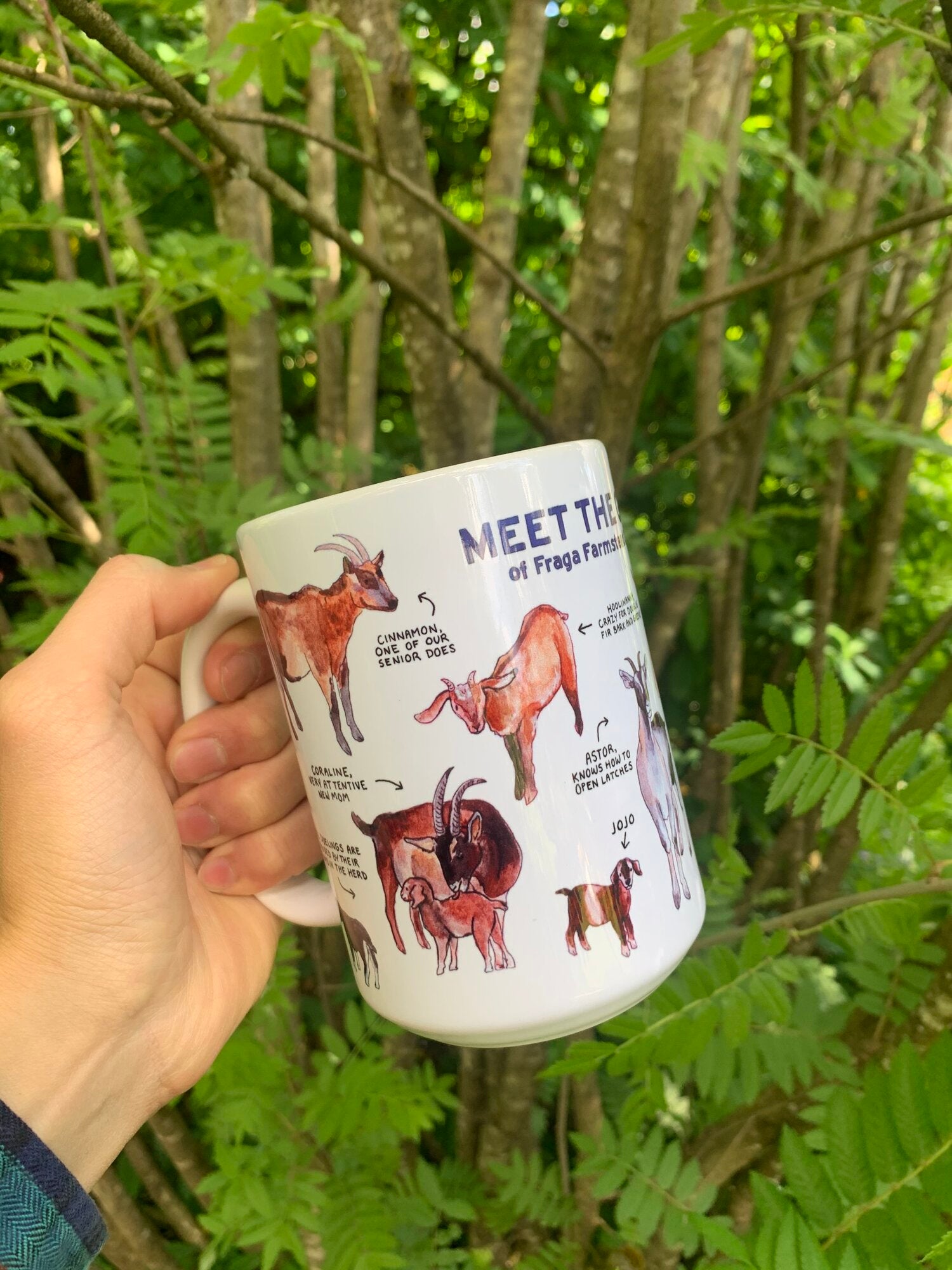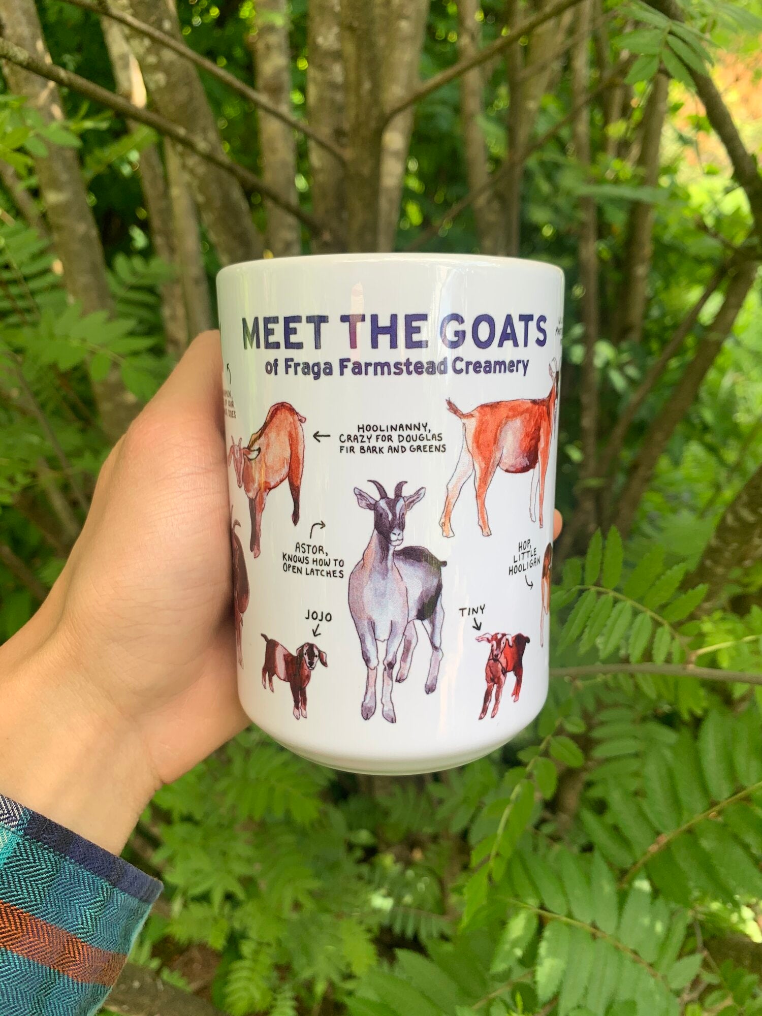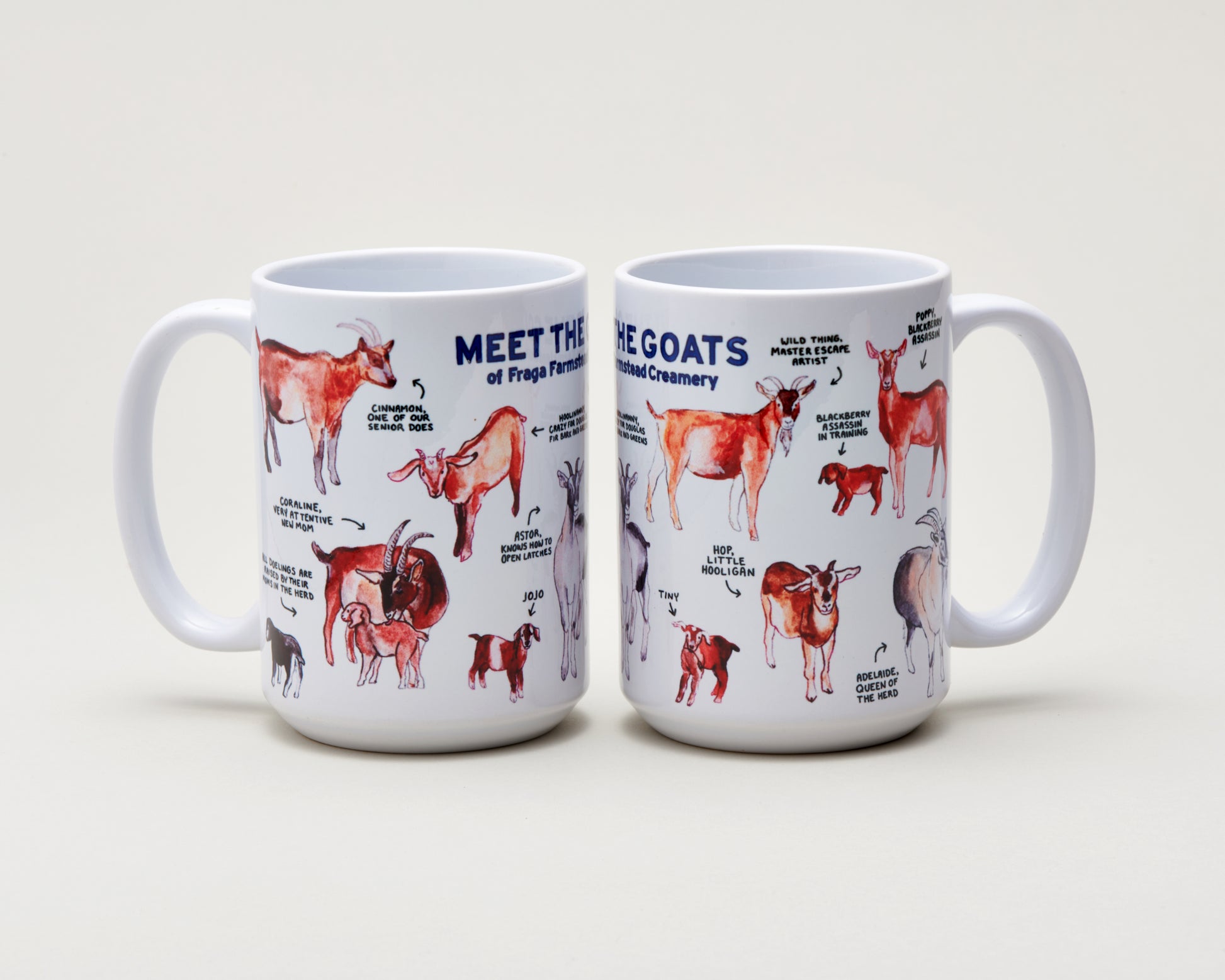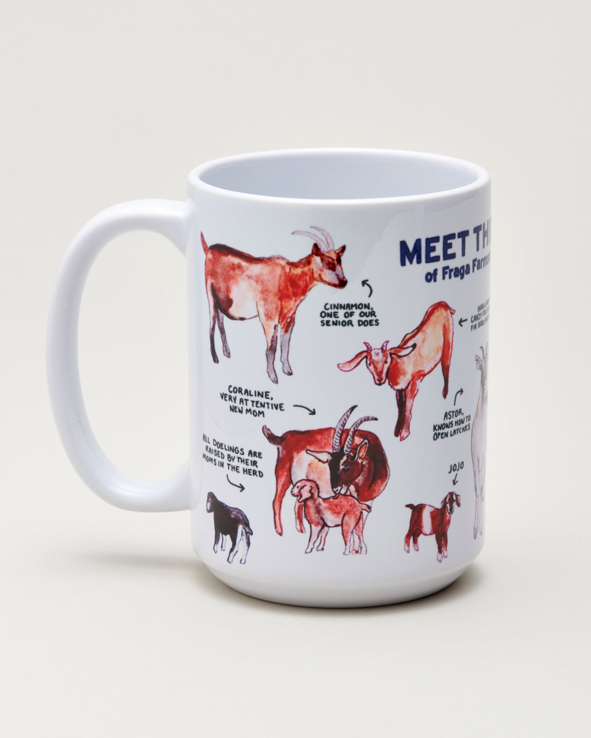 Wrap your mitts around this limited time only mug featuring some of our amazing goats! Designed by artist Kat Bourek for Fraga Farm. 15 oz. capacity.